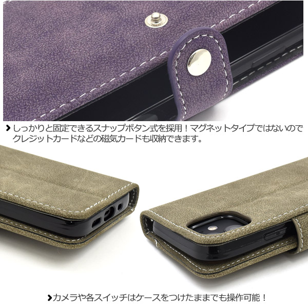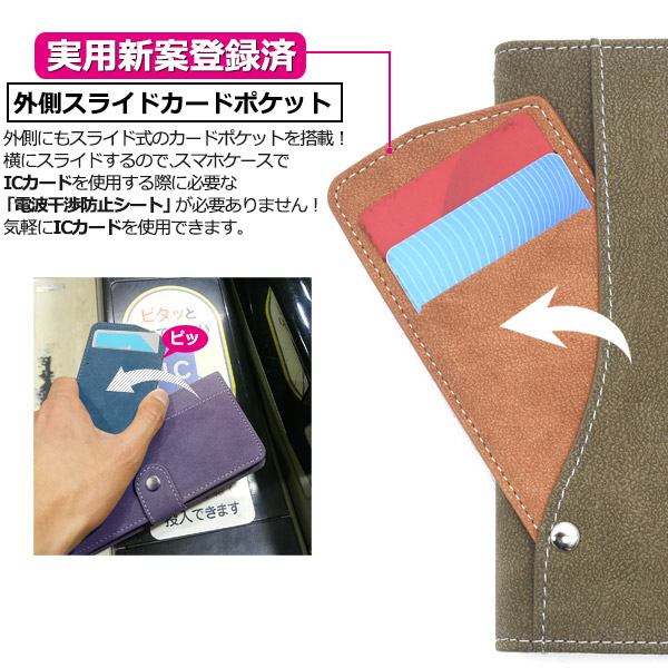 スライドカードポケット手帳型ケース。 背面にもスライド式のカードポケットを搭載!(実用新案登録済) ICカード収納に最適です。 しかも横にスライドするので、スマホケースでICカードを使用する際に必要な 「電波干渉防止シート」が必要ありません!!気軽にICカードを使用できます。 滑らかな手触りソフトレザーデザイン。持つ度に手にしっくりと馴染みます。 背面を折り返すとスタンドとして使用できるので、動画視聴に便利です。 落下防止に便利なストラップホール付きです。 横開きタイプなので、手帳のように使うことができます。 しっかりと固定できるスナップボタン式を採用!マグネットタイプではないので クレジットカードなどの磁気カードも収納できます。 | ||||||||||||||
