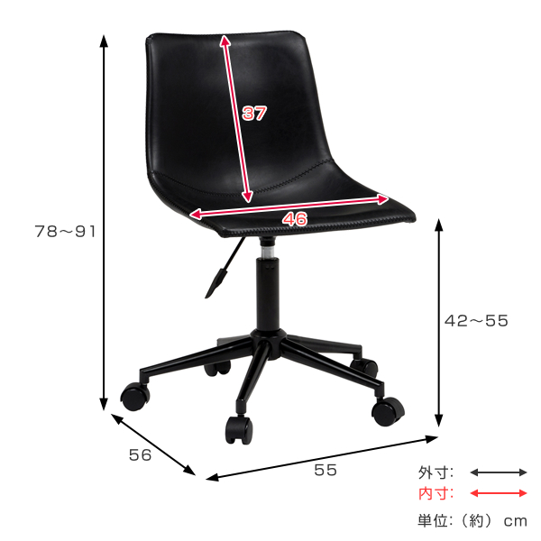 | サイズ | 約 幅55×奥行56×高さ91(cm) 昇降式:高さ 78〜91(cm) 座面高:42〜55(cm) |