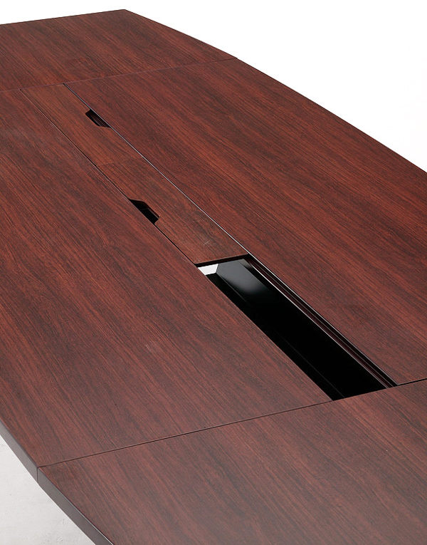 天板中央に配線ボックスがあり、PCやマイクを使った8〜10人でのミーティングに適しています。天板はフラットエッジ仕上げです。※天板の継ぎ目で木目の柄は合いません。