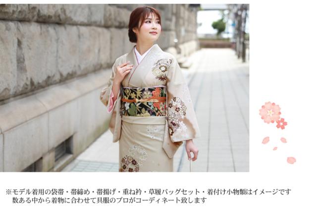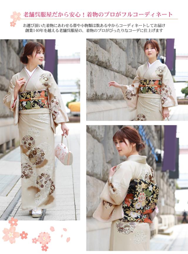 | ※モデル着用の袋帯・帯締め・帯揚げ・草履バッグ・小物類の色、デザインはイメージです。 数ある中から呉服のプロがコーディネートしてお届け致します。 | |||
