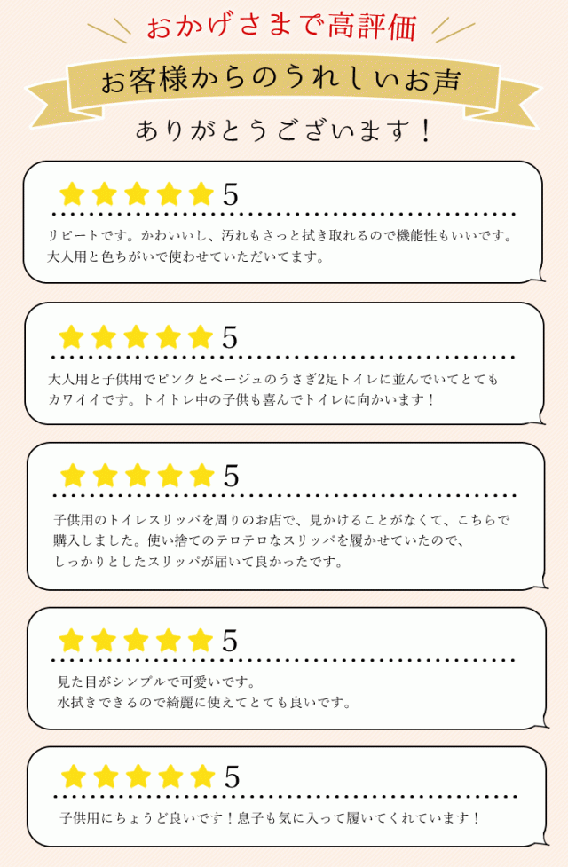 - 子供用のトイレスリッパを周りのお店で、見かけることがなくて、こちらで購入しました。使い捨てのテロテロなスリッパを履かせていたので、しっかりとしたスリッパが届いて良かったです。