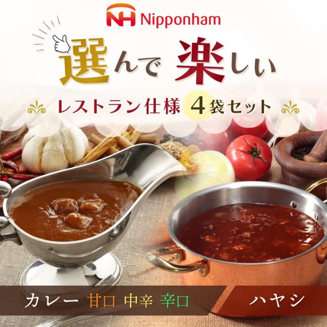 レトルト食品 詰め合わせ 常温 レストラン仕様 4種類から 選べる レトルト カレー ハヤシ 4袋 セット 【 送料無料 北海道沖縄以外】 日本ハム レトルトカレー 甘口 中辛 辛口 ハヤシライス 仕送り ご飯 食品 お年賀 2026 帰省 お土産 ギフト