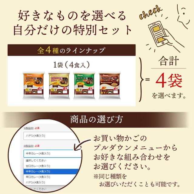 ■ レストラン仕様 (1袋 4食入) カレー 甘口 170g カレー 中辛 170g カレー 辛口 170g ハヤシ 135g 4種類の中から4袋お選びいただけます。 |