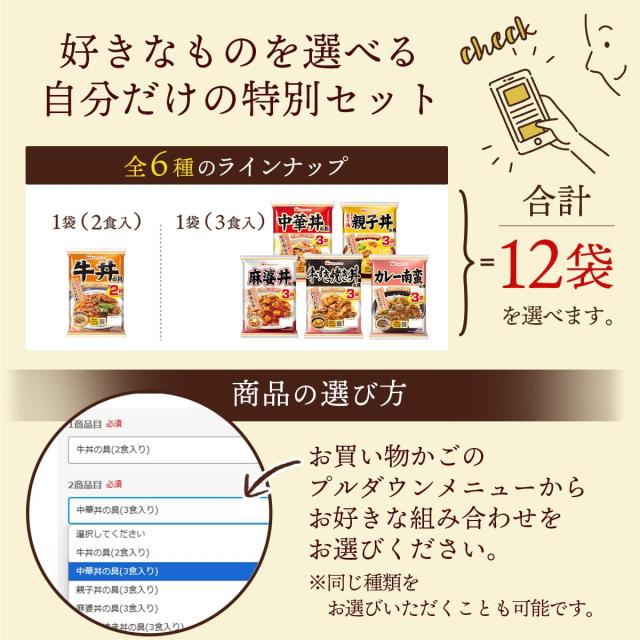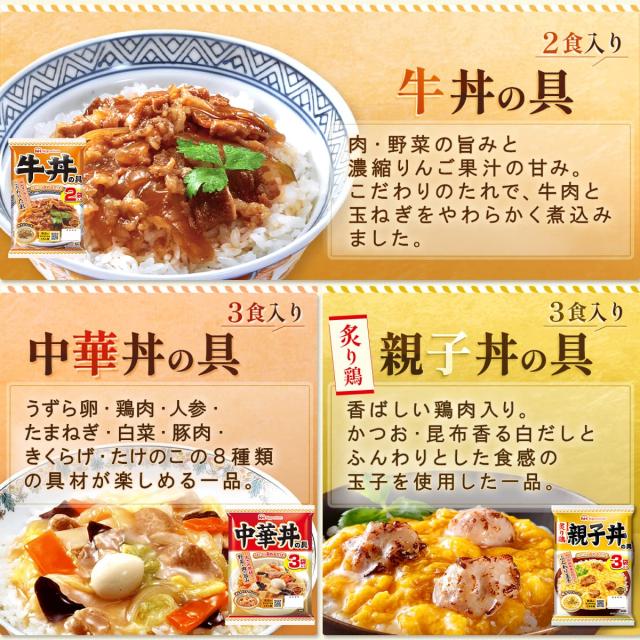 ■ どんぶり繁盛 (1袋 2食入) 牛丼の具 120g ■ どんぶり繁盛 (1袋 3食入) 中華丼の具 138g 親子丼の具 160g 麻婆丼の具 140g 牛すき焼き丼の具 95g カレー南蛮の具 110g 6種類の中から12袋お選びいただけます。 |