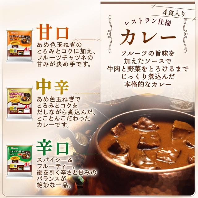 ■ レストラン仕様 (1袋 4食入) カレー 甘口 170g カレー 中辛 170g カレー 辛口 170g ハヤシ 135g 4種類の中から8袋お選びいただけます。 |