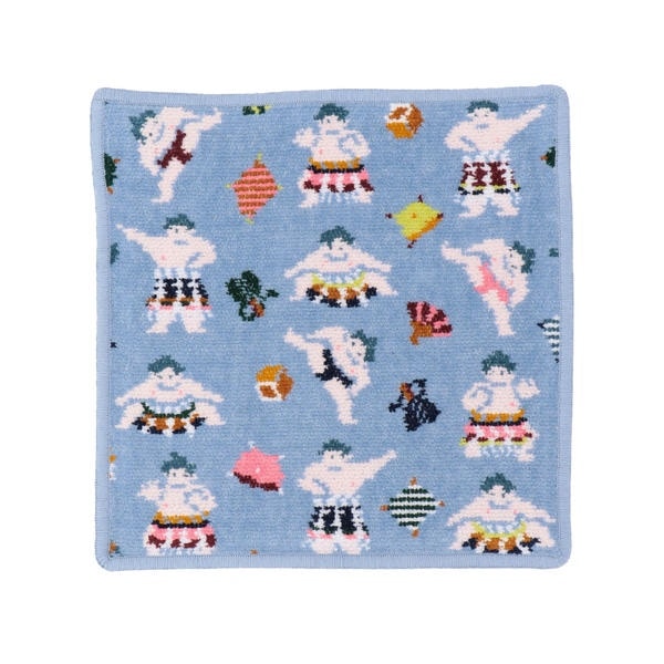 カラフルな化粧まわしをつけて土俵入りする横綱や立ち合い前に力強くしこを踏むお相撲さんたちをポップに描いた『ハッケヨイ』柄のハンカチです。行事が軍配を持って現れると会場の熱気も最高潮に。