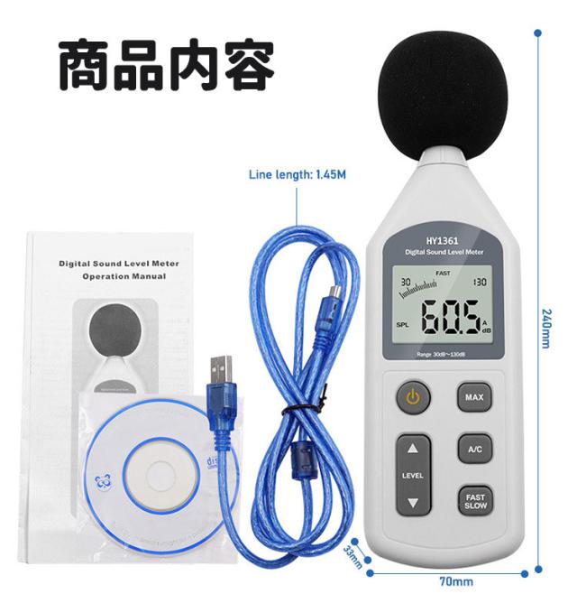 セット内容:騒音計、USBデータ転送用ケーブル、英語マニュアル、CD-ROM