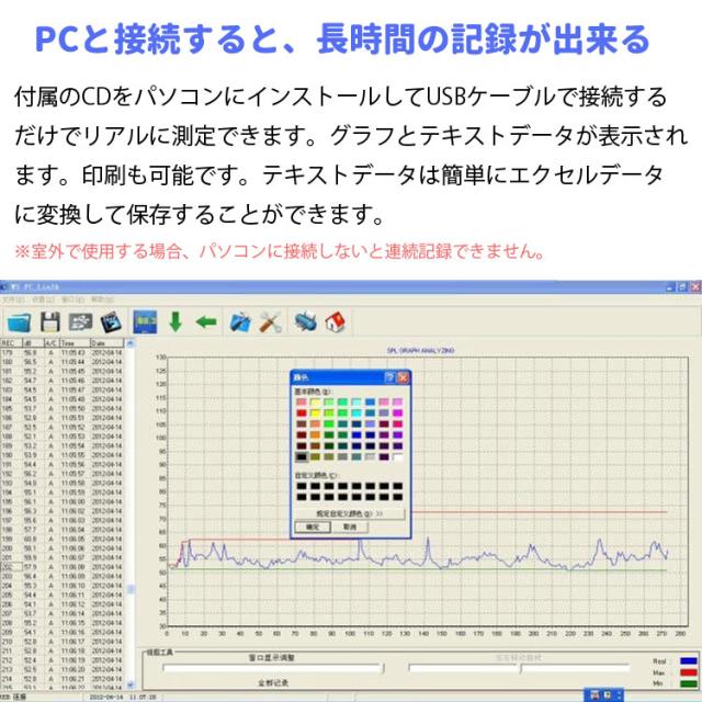 商品は付属のUSBケーブルでパソコンに接続してリアルタイム測定結果をパソコンへ表示できます。