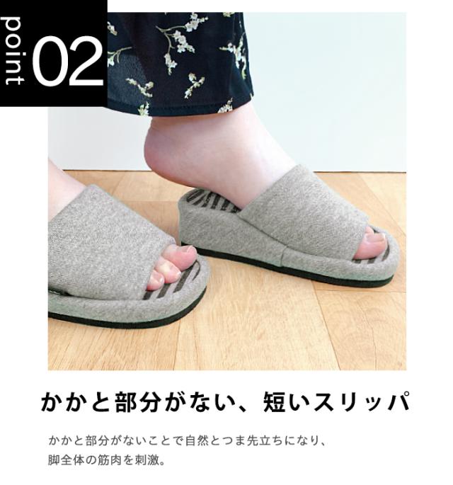 かかと部分がないことで自然とつま先立ちになり、脚全体の筋肉を刺激します。
