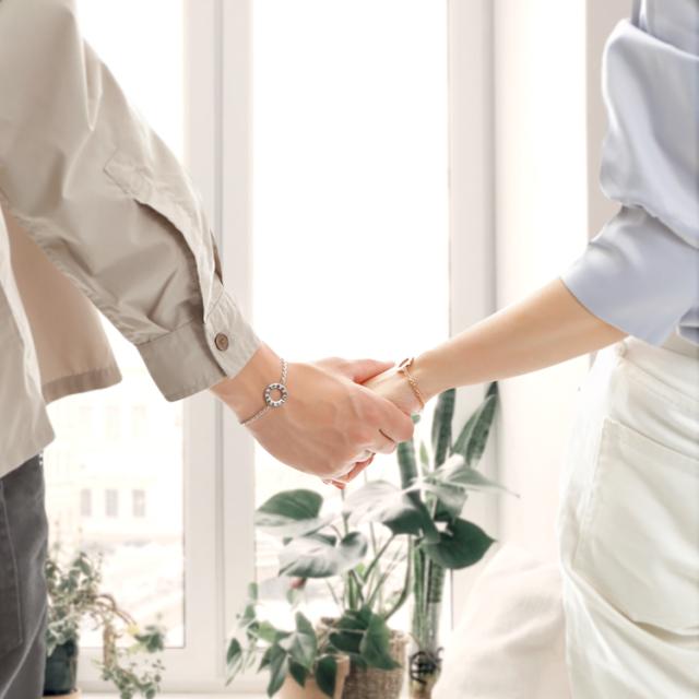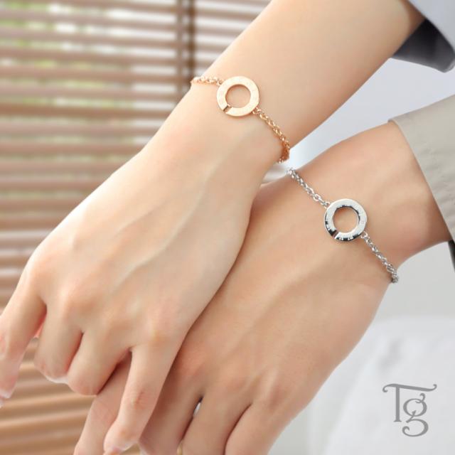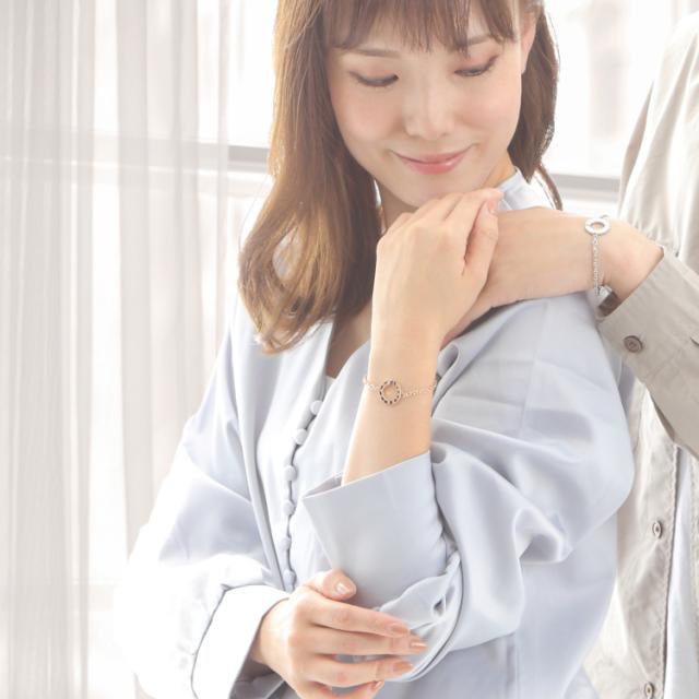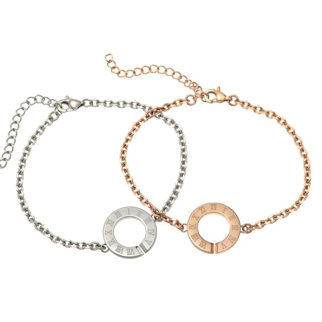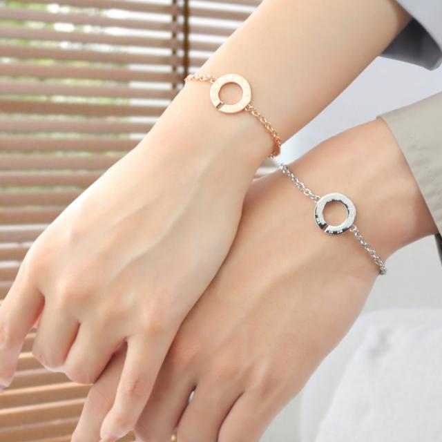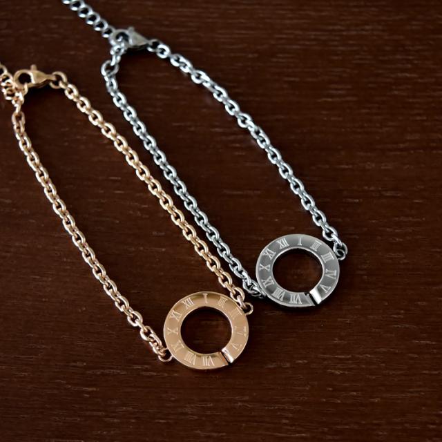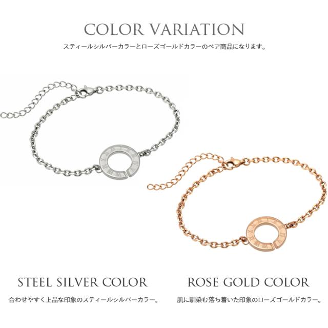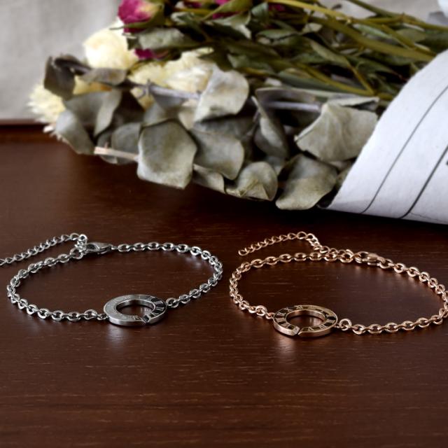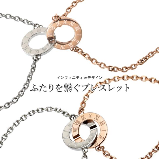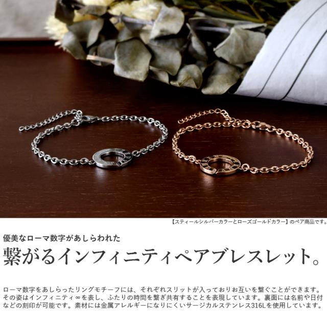 優美なローマ数字があしらわれた、繋がるインフィニティペアブレスレットです。【スティールシルバーカラー&ローズゴールドカラー】 ローマ数字をあしらったリングモチーフには、それぞれスリットが入っておりお互いを繋ぐことができます。その姿はインフィニティ∞を表し、ふたりの時間を繋ぎ共有することを表現しています。 素材には金属アレルギーになりにくいサージカルステンレス316Lを使用しています。 裏面には名前や日付、メッセージなど無料で刻印をお入れすることができるので、誕生日、記念日、クリスマス、ホワイトデー、母の日、父の日など特別なギフトにおすすめです。