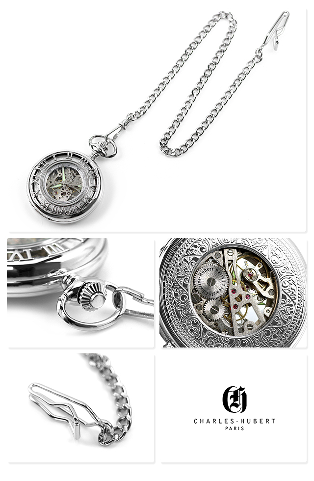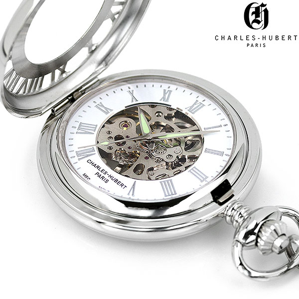 正規品 チャールズ ヒューバート 47mm デミハンターケース 手巻き ユニセックス メンズ レディース 懐中時計 ポケットウォッチ CH-3928 CHARLES HUBERT アナログ ホワイト ◆CHALES-HUBERT(チャールズ・ヒューバート)は、1992年フランスの宝飾デザイナーチャールズ・ヒューバートとアメリカのウォッチメーカーにより生み出された世界最大級の懐中時計ブランドです。熟練した時計製作の技術とレトロとモダンが調和したデザインが組み合わさることで、アメリカ・アジアを中心に時計を愛する多くの熱心なファンを獲得しています。 上蓋が付いているハンターケースタイプの懐中時計。中央部分がスケルトンになっており、ムーブメントの動きを楽しめる仕様になっています。記念日などの贈り物にもおすすめです。 機械式時計