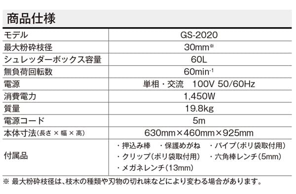 | 付属品 | ・保護めがね ・押込み棒 ・シュレッダーボックス ・ツールセット(車輪取付用) ・パイプ(ポリ袋取付用) ・クリップ(ポリ袋取付用) ・六角棒レンチ ・メガネレンチ(13mm) |