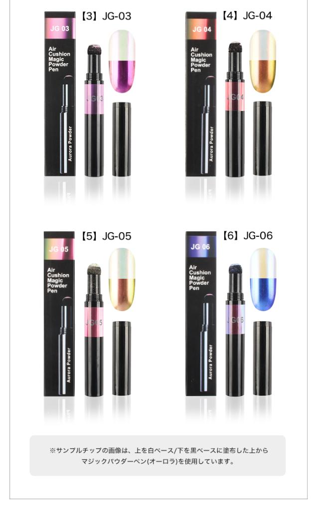 | 商品説明 | 人気のマジックパウダーペンから、6色のオーロラカラーが新登場♪ キャップの内側に、固形パウダーが内蔵されているので粉飛びせず使いやすい☆ 全面アートはもちろん、ニュアンスネイル等のポイント使いにも最適です♪ ベースのカラーによって発色が変化するのでアレンジ自在!! オーロラネイルや氷ネイルにも◎ |