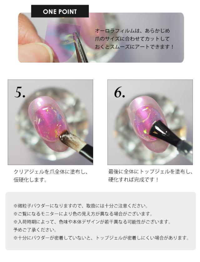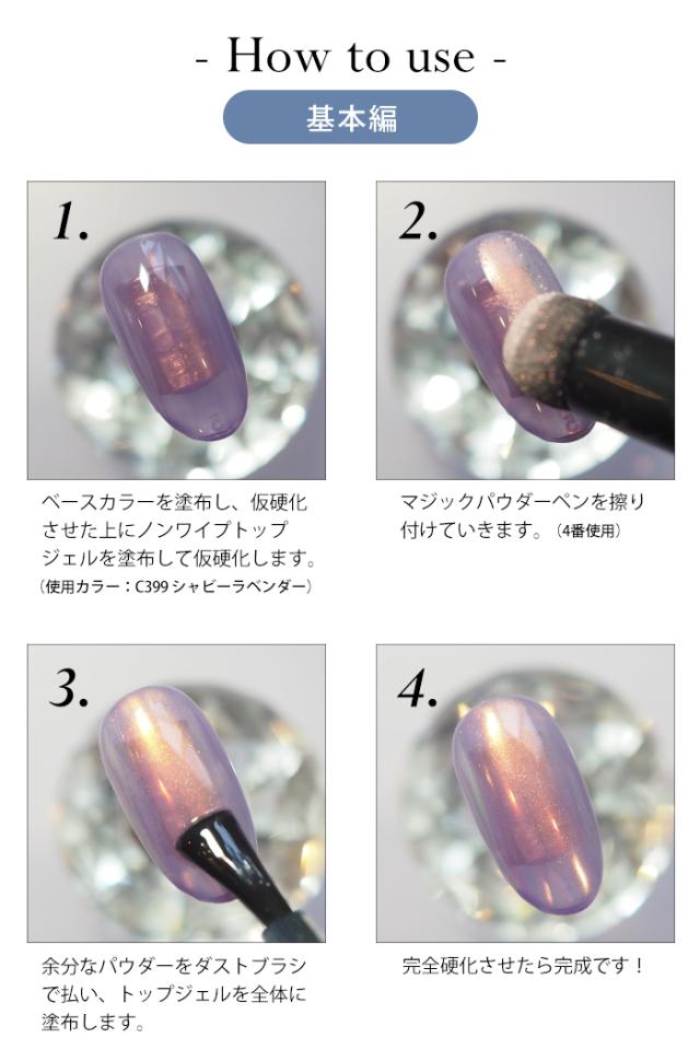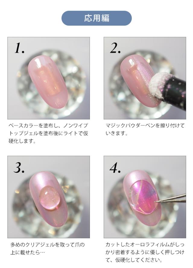 | ご使用方法 | [基礎編] 1.ベースカラーを塗布し、仮硬化させた上にノンワイプトップジェルを塗布して仮硬化します 2.マジックパウダーペンを擦りつけていきます 3.余分なパウダーをダストブラシで払い、トップジェルを全体に塗布します 4.完全硬化させたら完成です [応用編] 1.ベースカラーを塗布し、ノンワイプトップジェルを塗布後にライトで仮硬化します 2.マジックパウダーペンを擦りつけていきます 3.多めにクリアジェルを取り、爪の上にのせます 4.カットしたオーロラフィルムがしっかり密着するように 優しく押し付けて仮硬化します ※オーロラフィルムは予め爪のサイズに合わせてカットしておくとスムーズにカットできます! 5.クリアジェルを爪全体に塗布し、仮硬化します 6.全体にトップジェルを塗布し、完全硬化すると完成です |
