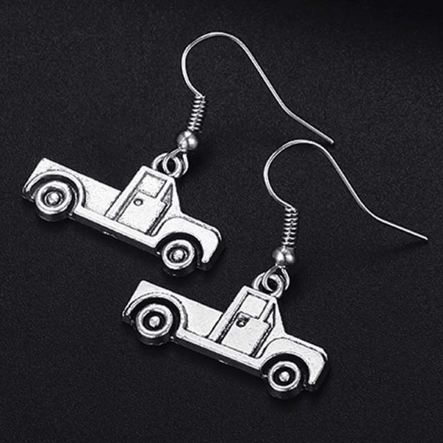 銀色シルバーの荷台のあるピックアップトラックをモチーフにしたチャーム揺れるフックタイプのステンレスピアス。