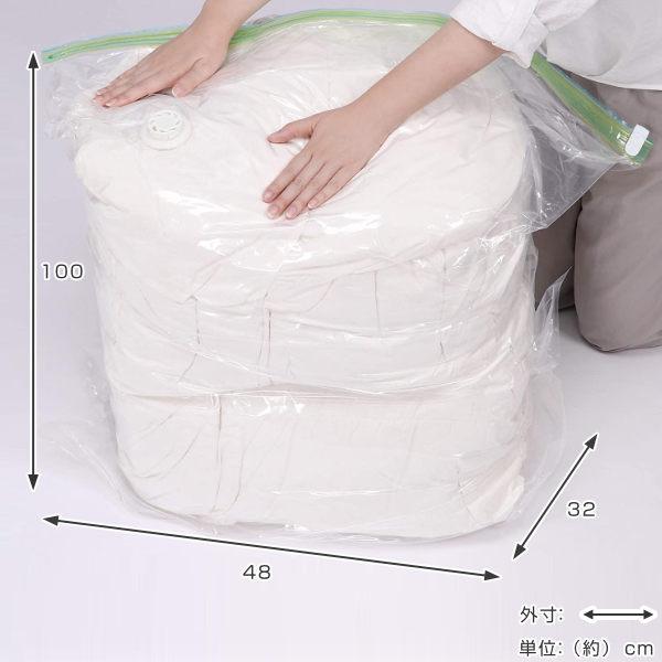 上から押すだけで簡単に圧縮できる布団用圧縮袋Lサイズです。ダブル掛け布団など大き目の掛け布団の収納に適しています。手で空気を押し出すだけで簡単に圧縮でき、掃除機要らずです。アウトドアシーンや引っ越しなどの荷造りの際にも便利です。