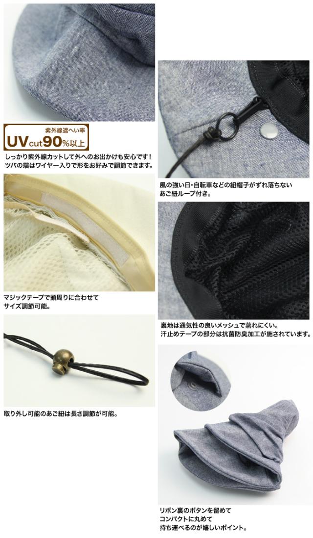 | 仕様 | ・UVカット加工 ・ツバワイヤー入り ・あご紐ループ付き ・サイズ調節テープ付き ・抗菌防臭加工 ・リボン裏にスナップボタン付き | |||