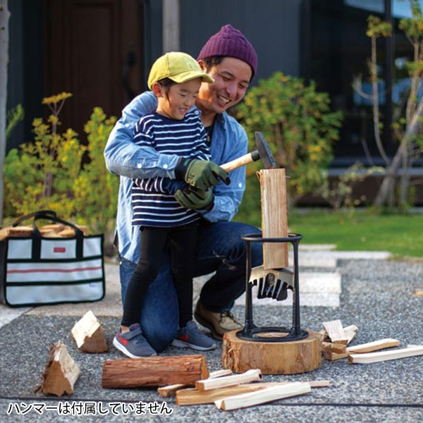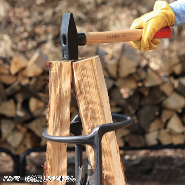 ・薪を安全リングの中に通し、片手で薪を軽く支えながら刃に食い込む程度にハンマーで軽く叩きます。手の支えをはずし、引き続きハンマーでたたき割ります。
