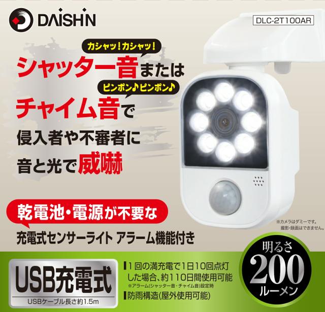 大進 充電式センサーライト アラーム機能付き DLC-2T100AR センサーライト USB 人感 ledセンサーライト 屋外 屋内 防犯ライト 防犯 屋外 電気工事不要 取付バンド 人感センサーライト 屋外 防犯ライト 玄関灯 国内メーカー 1年保証 節電 防雨 防犯 ガーデンライト