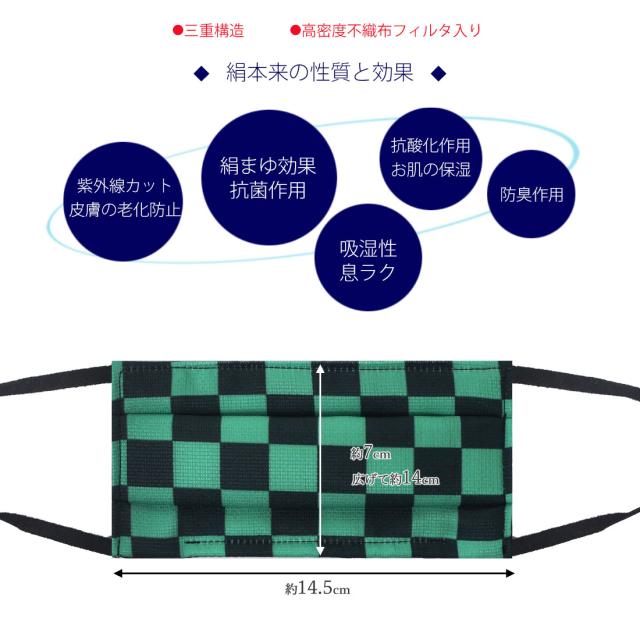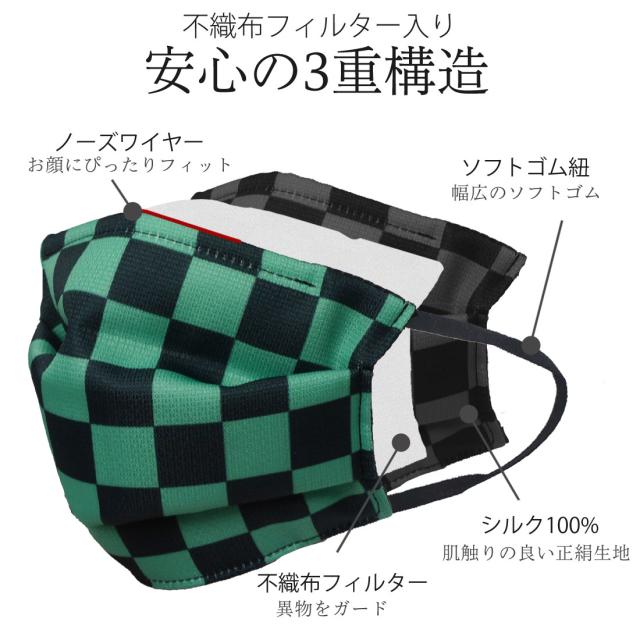 3重構造 子ども用 シルク マスク 市松柄 キッズサイズ 肌に優しい 絹100% 高品質シルク 男女兼用 ウイルス対策 日本国内発送 ウイルス 花粉 不織布フィルター入り 送料無料 子供用
