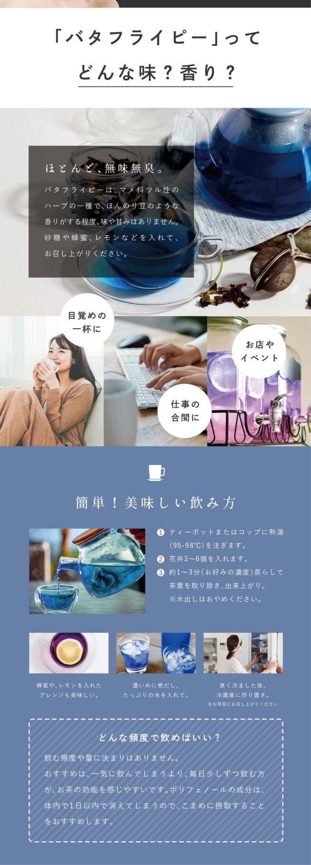 バタフライピー特有の鮮やかなブルーはドリンクやスイーツの演出に最適で、カフェ・サロン・イベントにもおすすめ。