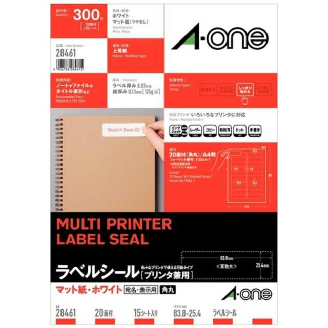 エーワン ラベルシール[プリンタ兼用]マット紙・ホワイト(A4サイズ・20面・15枚) 28461