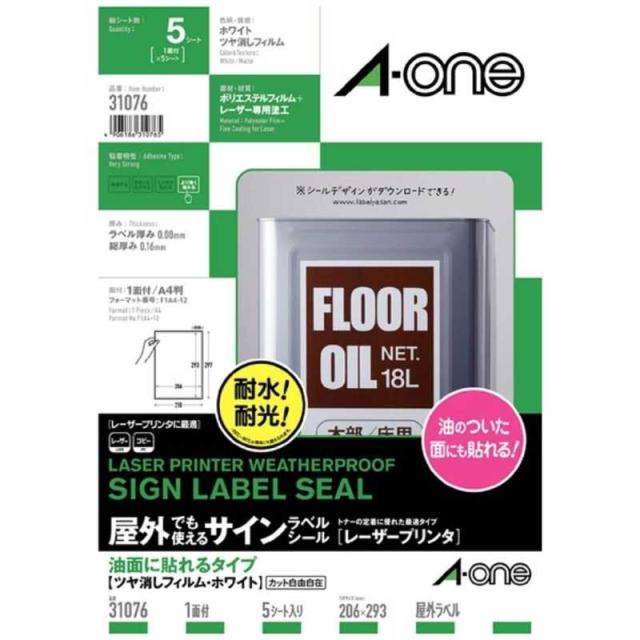 エーワン 屋外でも使えるサインラベルシール[レーザープリンタ] (A4サイズ:1面・5シート) 31076