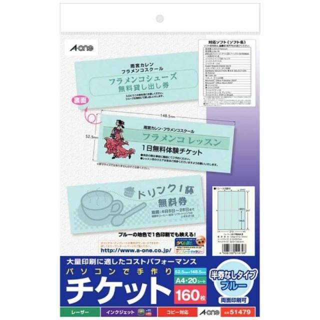 エーワン パソコンで手作りチケット(半券なしタイプ) A4・8面×20シート 51479