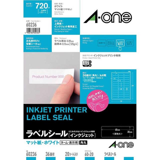 エーワン ラベルシール「インクジェット」(A4サイズ:36面・20シート:720片) 60236