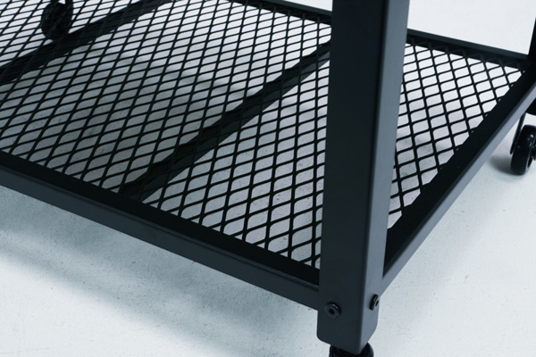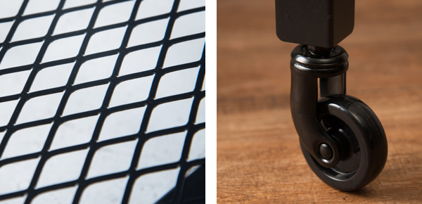 | メッシュ棚板 網の太さは約0.3cmでがっちりしており、無機質で無骨なインダストリアルな雰囲気に仕上げています。 | 雰囲気を損ねないこだわり キャスターはフレームに合わせたオールブラック仕様で、雰囲気を損ねないデザインです。 |