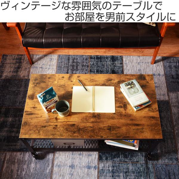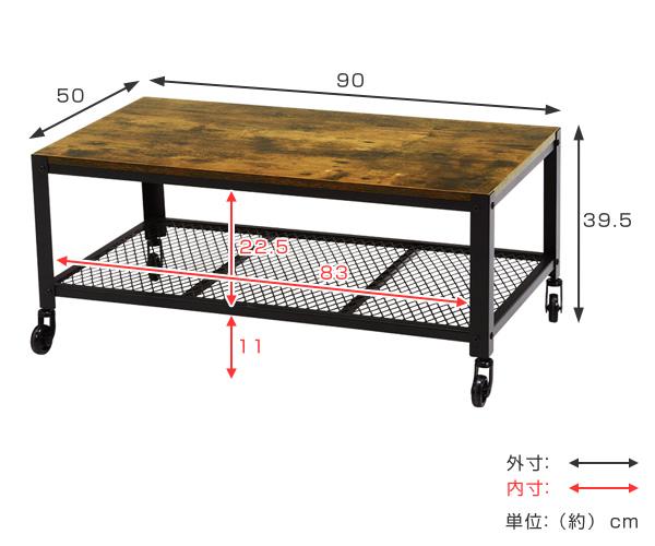 センターテーブル 幅90cm キャスター付き 木目調 ヴィンテージ調 テーブル ラック 収納 ( 机 リビングテーブル ローテーブル 90 ソファテーブル メッシュ スチール 棚 カフェテーブル コーヒーテーブル おしゃれ 長方形 )