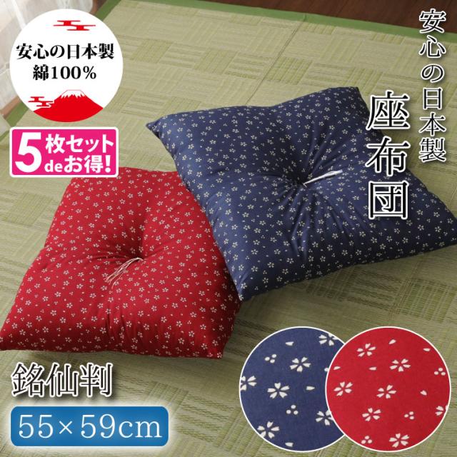 【5枚組】座布団 銘仙判 和柄 綿100% 日本製 洗える 約55×59cm 桜 さくら柄 コットン 業務用 新生活 モダン おしゃれ セット
