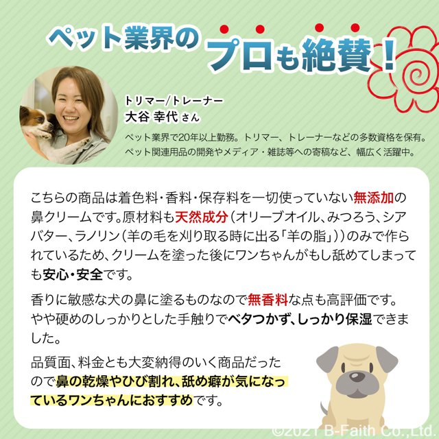 - 注文して直ぐ届きました。 天然成分で安心です。 犬のお鼻が潤ってます。