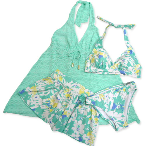 水着 レディース ビキニ カバーアップ 4点セット 9M 送料無料 サイズ 9号 花柄 ミントグリーン(s13519-1)