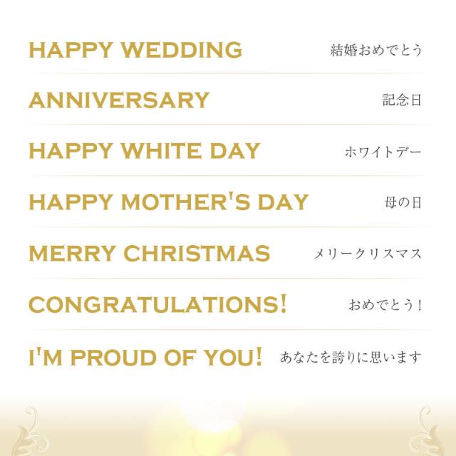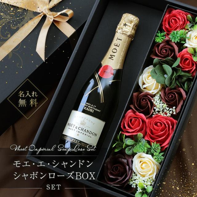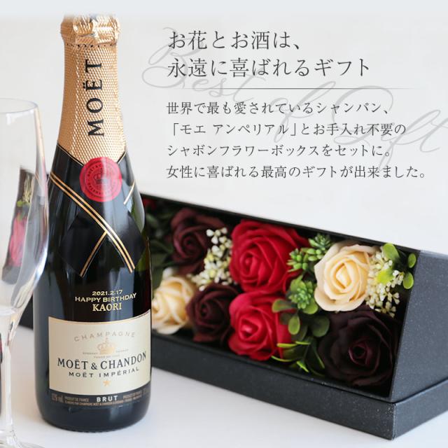\ 最も愛されるシャンパンブランド / 「 お花とお酒 」は永遠に喜ばれるギフトセット。 定番のモエ・エ・シャンドン モエ・アンペリアルに 記念に残るメッセージと日付、特別感のある名入れを施します。 絶対に外せない記念日に、 お手入れの要らないフラワーギフトと ずっと記念に残る彫刻ボトルのセットを♪ 1) 記念に残る無料ボトル彫刻 お酒が好きな女性なら、特別嬉しいシャンパンのプレゼント。 長年にわたり愛され続けるこのシャンパンなら 一度飲んだことがある方でも絶対嬉しい、特別なギフトに。 そんな間違いのない スパークリングワイン に、 お祝いにふさわしいゴールドの文字で当店にて彫刻を施します。 〔 日付彫刻 〕 “この日の記憶をずっと残したい” そんな気持ちを叶える日付彫刻。 目にする度に特別な日の思い出がよみがえります。 〔 選べる12種のメッセージ彫刻 〕 特別なギフトシーンにぴったりなメッセージが12種類。 大切な相手の事を想いながらお選びください♪ ・ HAPPY BIRTHDAY お誕生日おめでとう ・ LOVE FOREVER 永遠の愛 ・ WILL YOU MARRY ME? 結婚してください ・ THANK YOU ありがとう ・ JUST FOR YOU あなただけのために ・ HAPPY WEDDING 結婚おめでとう ・ ANNIVERSARY 記念日 ・ HAPPY WHITE DAY ホワイトデー ・ HAPPY MOTHER'S DAY 母の日 ・ MERRY CHRISTMAS メリークリスマス ・ CONGRATULATIONS! おめでとう! ・ I'M PROUD OF YOU! あなたを誇りに思います 〔 お名前彫刻 〕 名入れギフト専門店の当店が、気持ちを込めてお名前を彫刻いたします。 「 どうして 名前入り が喜ばれるの? 」 自分の名前が入った商品は世界にただ一つだけ。 “ 自分の事を考えながら選んでくれたんだ ” そんな風に感じさせてくれます。 だから、相手を大切に想う気持ちがより伝わります。 さらにお名前彫刻はずっと消えずに残るから、永く愛着を持って飾っていただけます。 だから、「名入れギフト」は大切な人に感謝の気持ちを伝えるのにぴったりなおくりもの。 私たちは、贈られた人も贈った人もみんなが笑顔になれる商品をお届けします。 2) 世界で最も愛されているシャンパン シャンパン、といえば“モエ”という方も少なくないはず。 「モエ アンペリアル」は、モエ・エ・シャンドンを代表とするシャンパンとして、 1869年の誕生以来、世界中の人々から愛され続けています。 皇帝ナポレオン1世に愛されたことでその名が世界に広まったといわれる、 大変人気の高い ワイン です。 リピーターやファンが多いこちらのワイン。 こんな特徴が人気の理由です。 ・フレッシュでエレガント、口当たりしなやかで芳醇 ・どんなお料理にも絶妙に調和する 「 女性が喜ぶシャンパン人気ブランドランキング 」 「 本当に美味しい おすすめ シャンパンランキング 」 など、シャンパンのランキングには必ずランクインしている モエ・アンペリアル。 定番で人気、だけど特別感のある 名入れシャンパン 。 だからギフトにぴったりなんです。 - 飲み切りサイズ - お祝いの乾杯にちょうどいい、 飲み切りサイズの ハーフボトル 。 最後の一口まで美味しくいただけます。 彫刻ボトルなら飾っておきたい! そんな方にも丁度いいコンパクトなサイズ感です。 3) 豪華!シャボンフラワーボックス 見て癒されて、香りに癒される 枯れない 花 観賞用シャボンフラワー。 お手入れ不要だから、忙しい方へのプレゼントにも最適です。 シャボンフラワー専用ボックスは高級感のある貼り箱。 取り出して飾っても見栄えのする仕様です。 だから玄関やリビングなど飾る場所を選らびません。 開けた時、その華やかさにはじめての感動。 癒される香りに感動。 香りと共に心に刻み込まれた思い出が 目にする度に思い出されます。 〔 カラーは選べる5種類 〕 ・ ピンク 女性好みナンバー1はやっぱりピンク。 華やかな印象です。 ・ レッド ロマンチックなシーンに 赤の薔薇はぴったり。 ここぞという時の選択に。 ・ ブルー 媚びない女性にぴったりな青色。 大人な印象です。 ・ オレンジ 元気いっぱいなビタミンカラー。 明るい気持ちになれる 黄色とオレンジが印象的。 ・ パープル 上品で高貴な印象の紫色。 神秘的なムードを演出するのにピッタリなカラーです。 【 無料ラッピング 】 このセットの為に作った、厚みのあるギフトボックス。 開けた瞬間、箱の黒色に鮮やかなお花のカラーが美しく映えます。 どんなシーンでも見劣りしない、高級感。 だから、特別な記念日にも自信を持ってお渡しいただけます。 〔こんなシーンでおすすめ〕 ・ 婚約者 彼女 奥様 恋人 女友達 への プレゼント に ・ 20代 30代 40代 50代 60代 女性に ・ 好きな人 への プロポーズ 告白 に合わせて ・ 友人の 結婚祝い 開店祝い に ・ 記念日 結婚記念日 入学祝い 卒業祝い に ・ 退職祝い 誕生日プレゼント に |