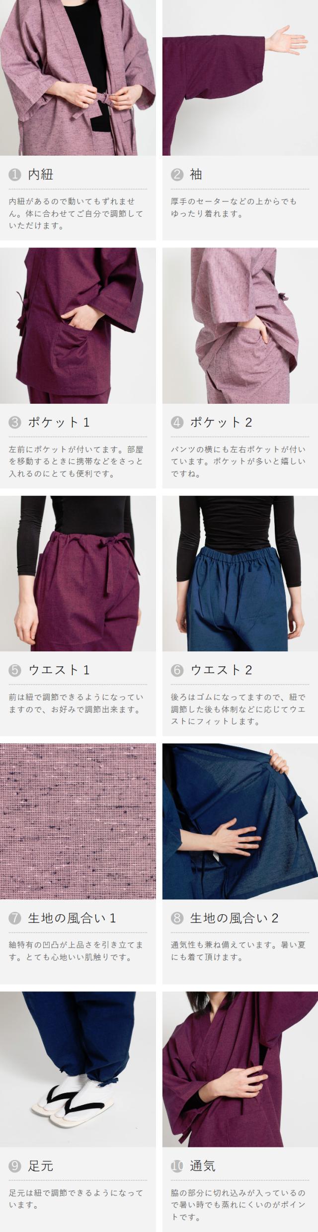 織物の産地として知られる福岡は久留米で作られた、柔らかな風合いの紬織作務衣。同じ綿素材でも、平織の作務衣とはまず肌触りや着心地が違います。