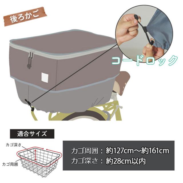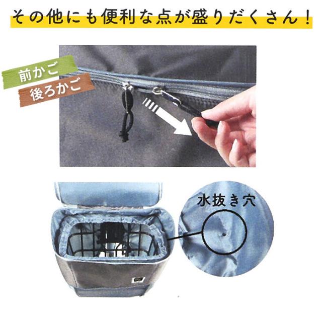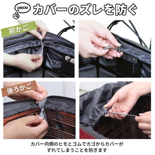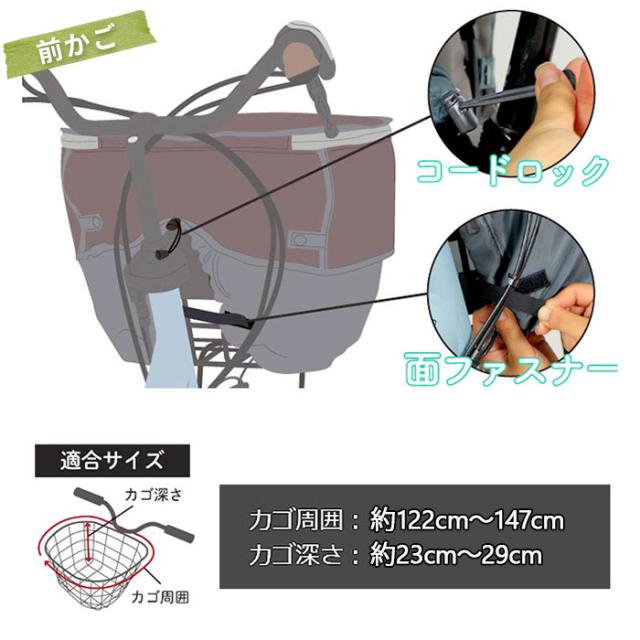 | 使用方法 | 【前カゴカバー】 1.タグを前にしてカバーを上から被せます。 2.被せきったら、カバー後ろにあるコードロックを絞って固定する。 3.コードロック下にある面ファスナーを閉める。 【後カゴカバー】 1.タグを後ろにしてカバーを上から被せます。 2.被せきったら、カバー後ろにあるコードロックを絞って固定する。 |