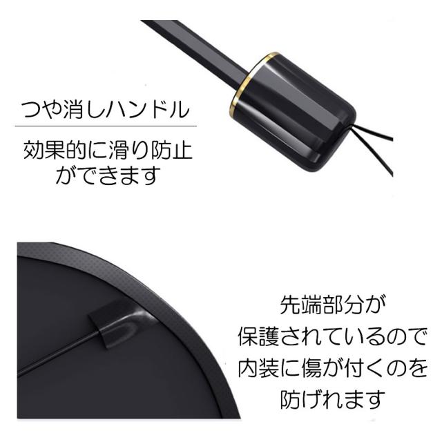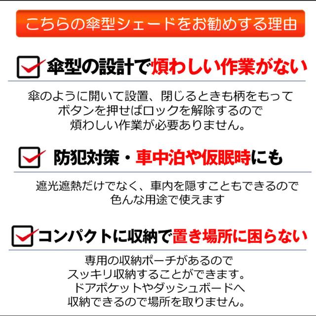 折りたたみ傘使用のカーサンシェード。傘型なので簡単に開閉・設置・収納ができます。 傘のように開いて設置、閉じるときも柄をもってボタンを押せばロックを解除するので煩わしい作業が必要ありません。
