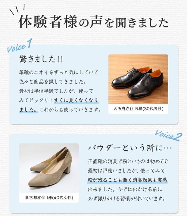 | 注意 | ※粉を入れすぎると靴内に粉が溶け残る場合がございます。 ※靴下に白く残る場合がございます。 ※ご使用後数時間は白い粉が残ります。 靴を脱ぐ際はご注意ください。 |