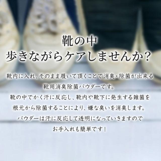 | 使用方法 | お出かけ前に左右の靴に2〜3回振り入れ、 全体に粉を広げてからそのまま履いてください。 30分〜1時間ほどで粉が解け、なくなれば除菌完了 粉は時間とともに目立たなくなります。 |
