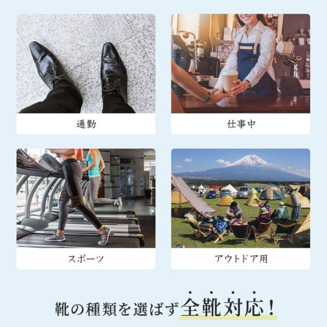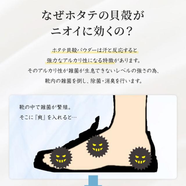 | 特徴 | 【ポイント】 靴の中でかく汗に反応し、靴内や靴下に発生する雑菌を根元から除菌! 革靴・ハンプス・ブーツ・運動靴など幅広くご利用いただけます 天然素材のホタテ貝殻を使用しているのでお子様にも安全&安心 【こんな場面に】 仕事で:通勤 通学 仕事中 立ち仕事 飲食店 受付 スポーツで:ランニング ジョギング ウォーキング ジム アウトドアで:フェス キャンプ バーベキュー お出かけで:デート 友達との食事 散歩 【おすすめの靴】 靴の種類を選らばず全ての靴に対応! スニーカー/運動靴/上履き/通勤靴/革靴/パンプス/ブーツ etc 【ホタテの力】 日本産ホタテ焼成パウダーが靴の中でかく汗に反応し 靴内や靴下に発生する雑菌を根元から除菌することにより 嫌な臭いを消臭します。 |