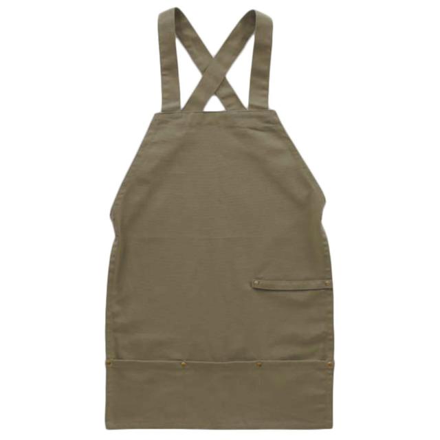 丈夫で長持ちする10ozのコットンキャンバス生地を使用したエプロンが登場。バッククロスのかぶるタイプなので、紐で縛る手間がないのがポイント。シンプルなデザインなので男女年代問わず使用ができる。前面に大きなポケットが3つ付属していて、収納力も抜群!タオル・手ぬぐい・ツール・筆記用具を掛けられるループ付き!ビンテージ調のリベットもオシャレポイント。キッチンやガーデニング等さまざまなシーンで大活躍。