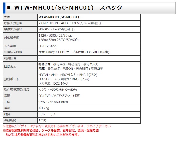AXC-MHC01(SC-MHC01)は、アナログハイビジョン信号の HDTVI・AHD・HDCVI信号をHD-SDI・EX-SDI信号に変換できる 2.0MP対応コンバーターです。