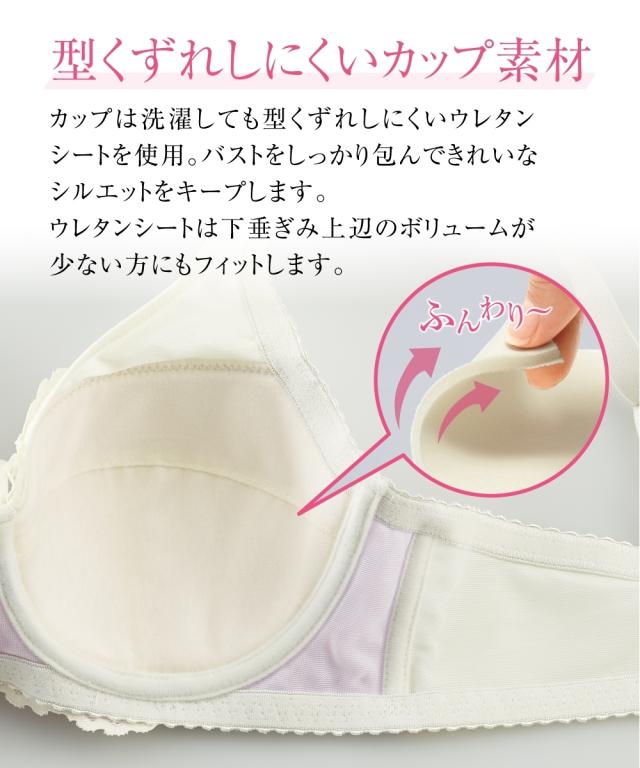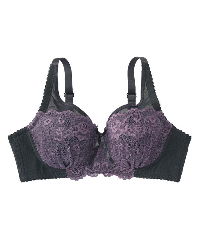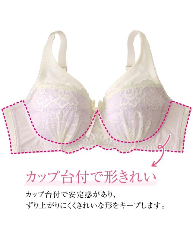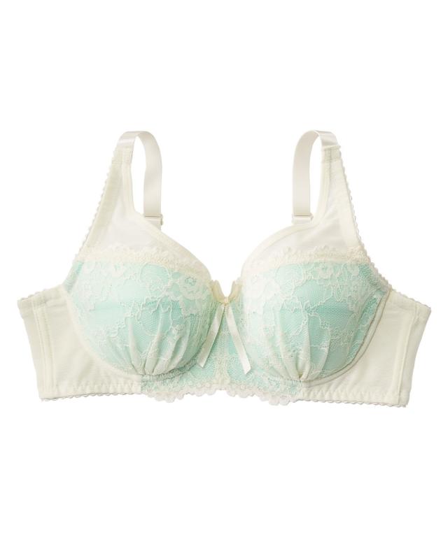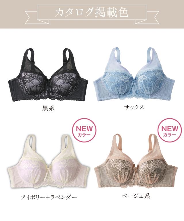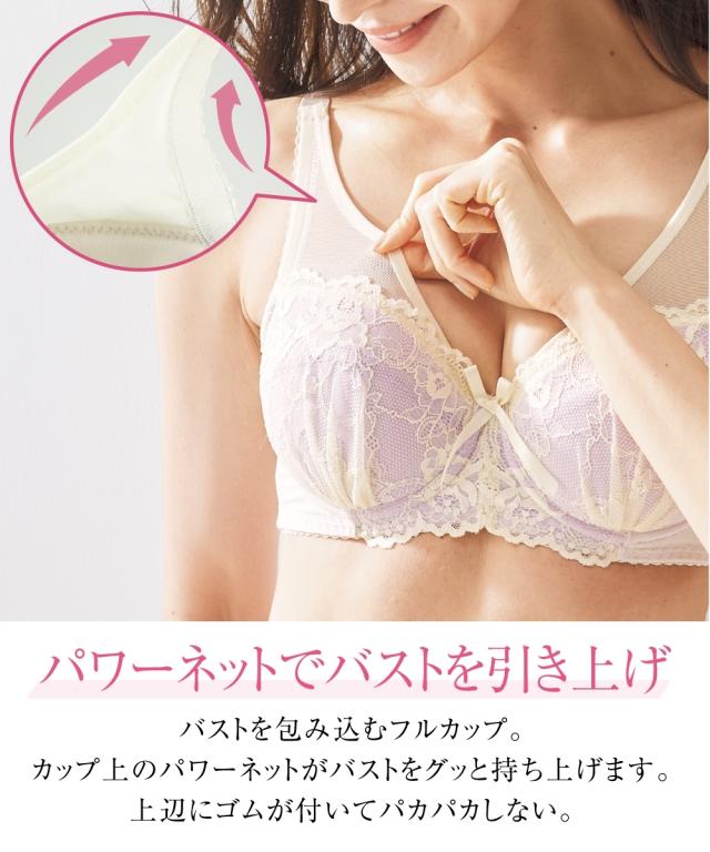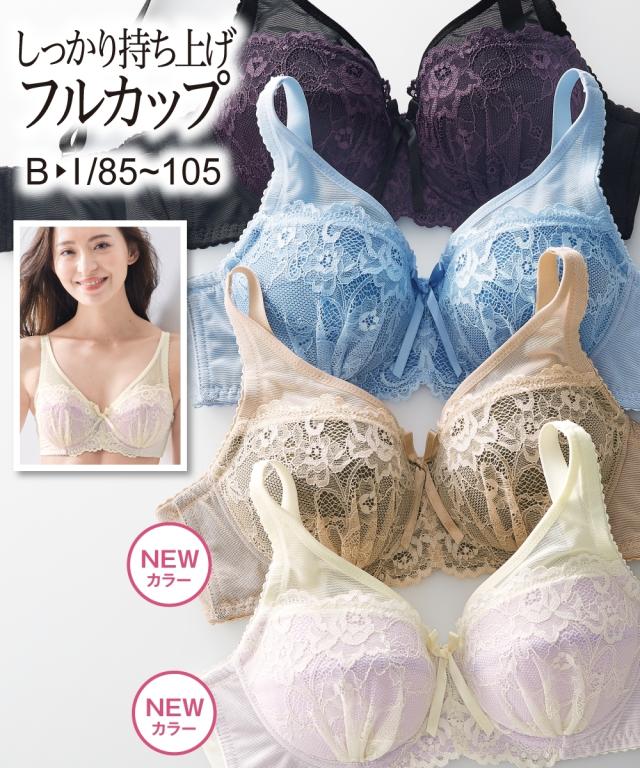 繊細な編みレースが美しいフルカップブラ。カップ上のパワーネットがバストをすっぽり包みこみ、グッと持ち上げてきれいなシルエットに整えてくれます。カップはソフトで心地よいウレタンシートで、洗濯しても型くずれしにくいのも◎。アンダーバスト105cmまで展開しているので、色もサイズもぴったりが見つかります♪