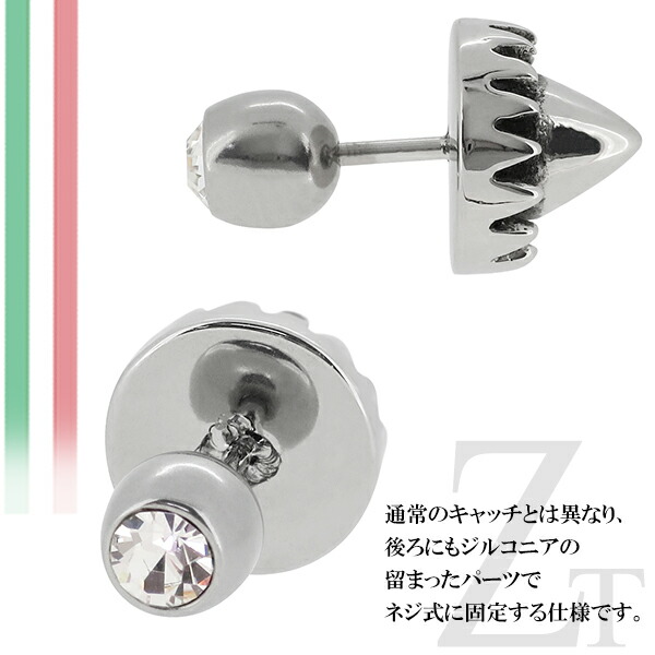 通常のキャッチとは異なり、後ろにもジルコニアの留まったパーツでネジ式に固定する仕様です。