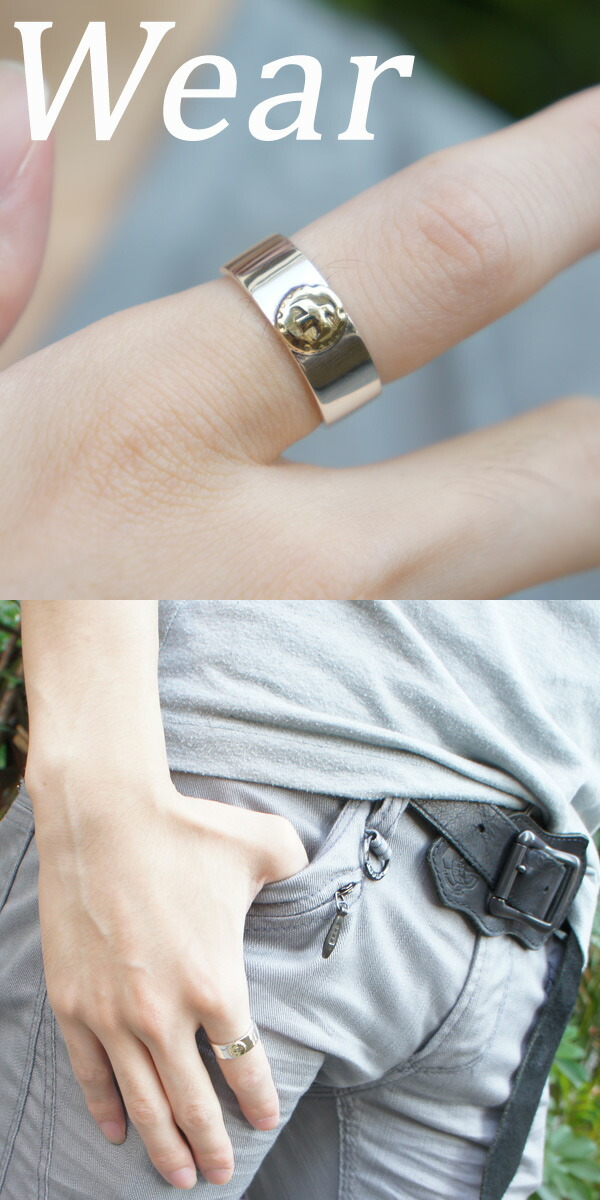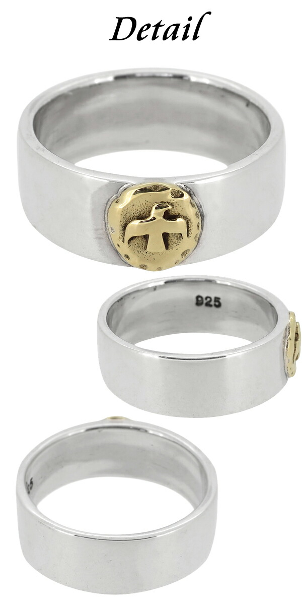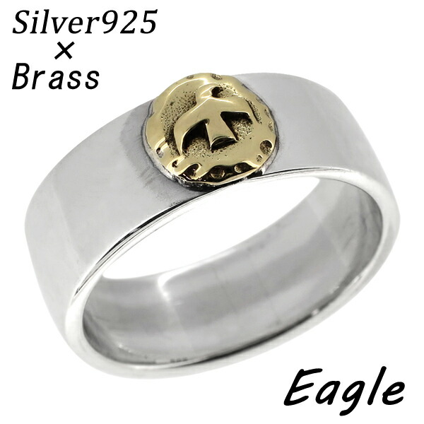 鏡面仕上げのシルバーと真鍮製メダルとの色合い、図案化されたイーグルのシンボルを浮き彫りにするなど、さりげないアクセントが効いたリング!