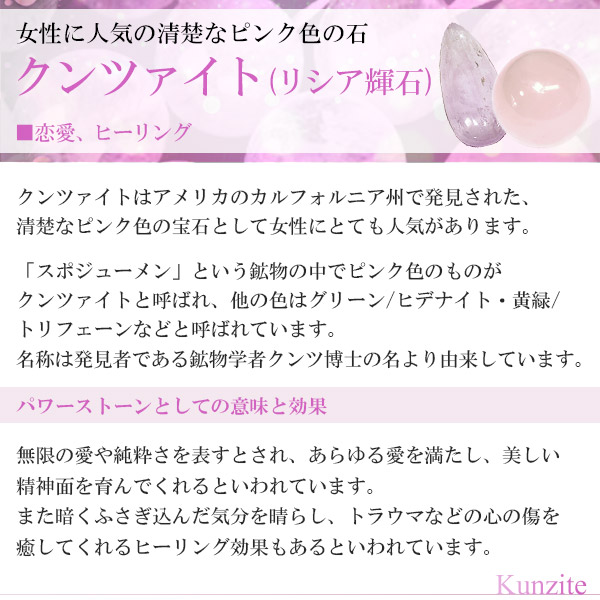 クンツァイト(リシア輝石)はアメリカのカルフォルニア州で発見された、清楚なピンク色の宝石として女性にとても人気がある天然石です。
