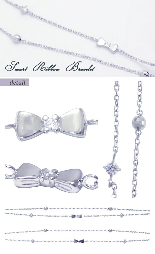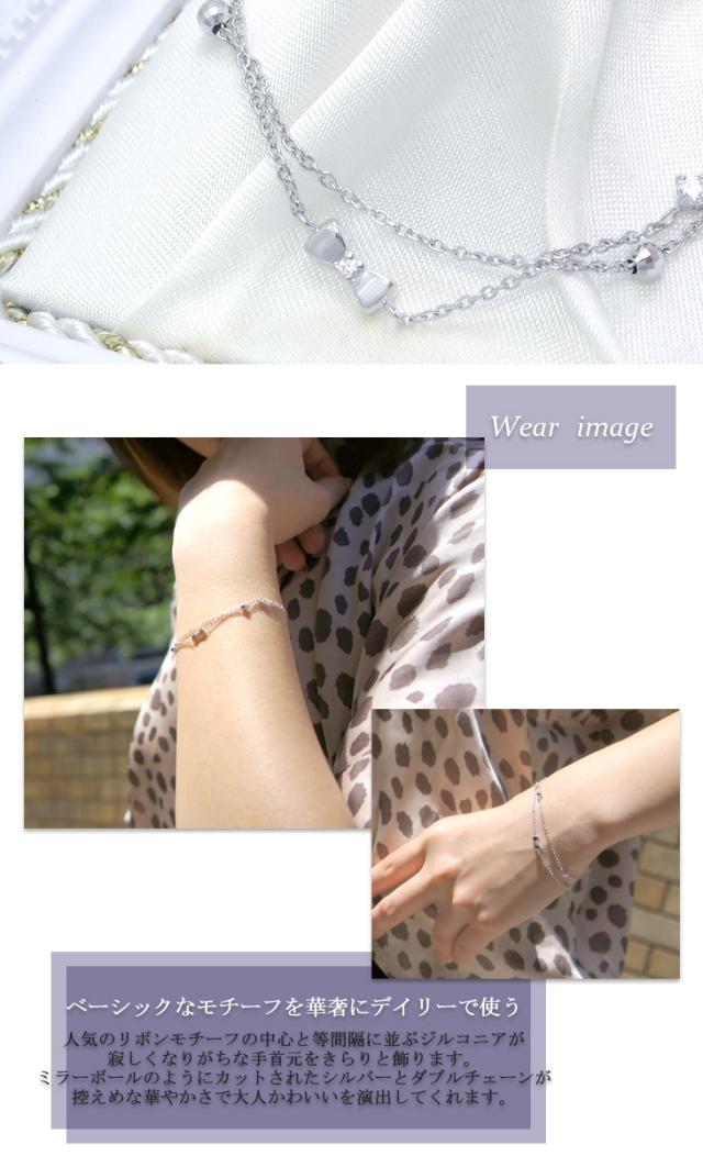 人気のリボンモチーフの中心と等間隔に並ぶジルコニアが寂しくなりがちな手首元をきらりと飾ります。