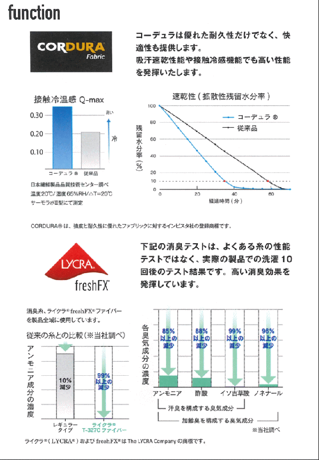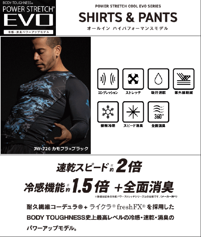 ■特徴 耐久繊維コーデュラ+ライクラfresh FXを採用した、BODY TOUGHNESS 史上最高レベルの冷感機能・速乾性・消臭のパワーアップモデル