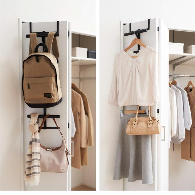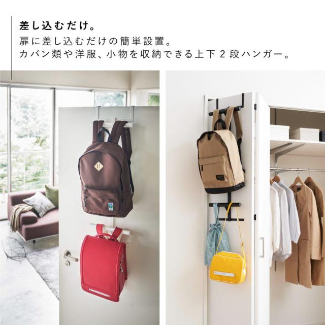 扉に差し込むだけで、ランドセルやリュック、洋服や小物を収納できる上下2段ハンガー。リビングや寝室の扉、クローゼットなど、よく使う場所に自由に取り付けて、スペースを活用できます。